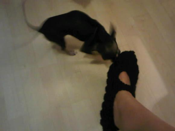 I completed a pair of Pocket Book slippers in black. No clue what the name of the yarn is since I haven’t a clue where the ball band went. I do know that I’m going to have to keep them away from Bruce. He already thinks they’re his toy. Little monkey.